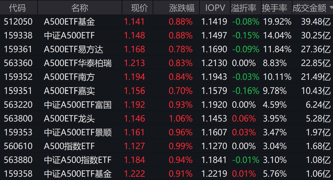 截至上午收盤,場內(nèi)跟蹤中證A500指數(shù)的ETF小幅上漲。其中,有12只中證A500相關ETF成交額超1億元,3只超27億元。A500ETF基金、中證A500ETF、A500ETF易方達早盤成交額分別為39.48億元、30.25億元、27.36億元。