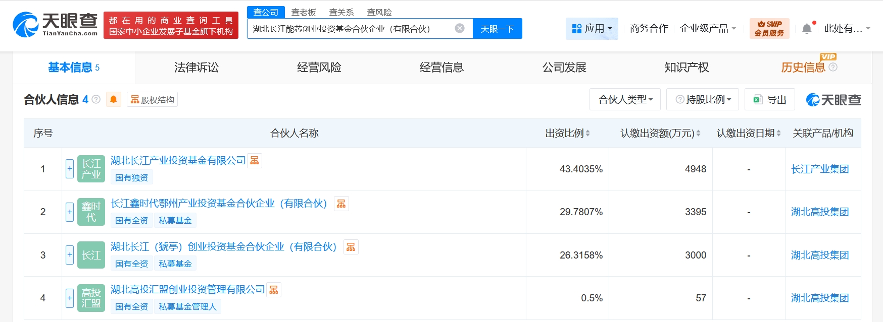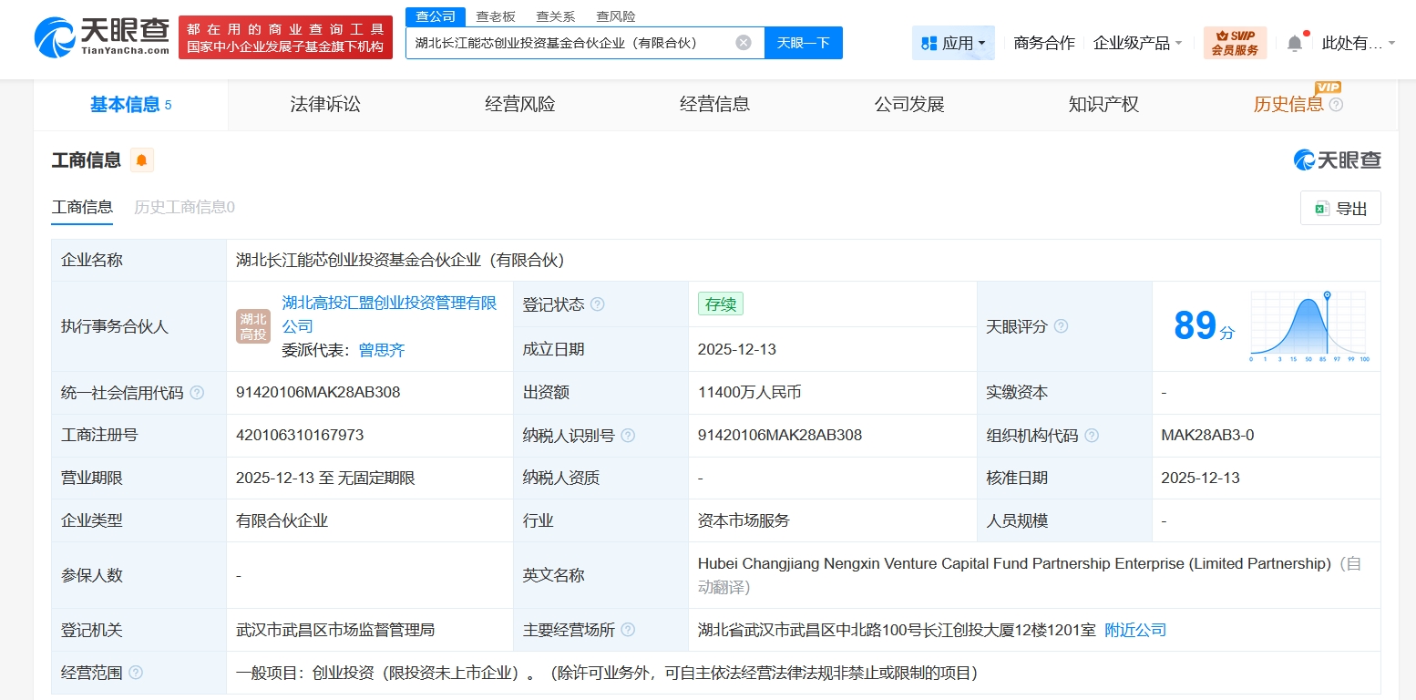 每經(jīng)AI快訊,天眼查App顯示,近日,湖北長江能芯創(chuàng)業(yè)投資基金合伙企業(yè)(有限合伙)成立,執(zhí)行事務(wù)合伙人為湖北高投匯盟創(chuàng)業(yè)投資管理有限公司,出資額1.14億元人民幣,經(jīng)營范圍為創(chuàng)業(yè)投資。合伙人信息顯示,該基金由湖北長江產(chǎn)業(yè)投資基金有限公司、長江鑫時(shí)代鄂州產(chǎn)業(yè)投資基金合伙企業(yè)(有限合伙)、湖北長江(猇亭)創(chuàng)業(yè)投資基金合伙企業(yè)(有限合伙)、湖北高投匯盟創(chuàng)業(yè)投資管理有限公司共同出資。