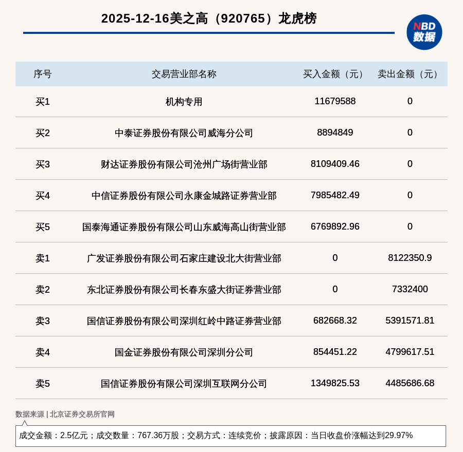 每經(jīng)訊,2025年12月16日,北交所上市公司美之高(920765,收盤價:34.74元)登上龍虎榜,交易方式是連續(xù)競價,披露原因是當日收盤價漲幅達到29.97%,成交數(shù)量767.36萬股,成交金額2.5億元。買一席位為機構(gòu)專用,買入1167.96萬元;賣一席位為廣發(fā)證券股份有限公司石家莊建設(shè)北大街營業(yè)部,賣出812.24萬元。