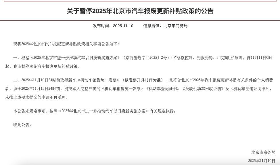 11月12日,北京市商務(wù)局發(fā)布《關(guān)于暫停2025年北京市汽車報(bào)廢更新補(bǔ)貼政策的公告》稱,根據(jù)“總額控制、先報(bào)先得、用完即止”原則,自11月11日0時(shí)起,北京市暫停實(shí)施汽車報(bào)廢更新補(bǔ)貼政策?!氨本┦幸呀?jīng)暫停的地方補(bǔ)貼和明年1月執(zhí)行的新能源汽車購置稅金額其實(shí)差不多?!币晃晃祦碇行模|方廣場)銷售人員對記者說。