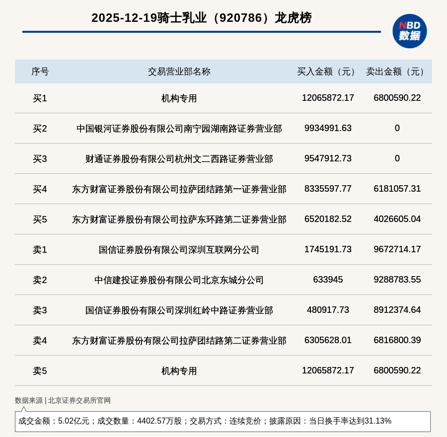 每經(jīng)訊,2025年12月19日,北交所上市公司騎士乳業(yè)(920786,收盤價:11.44元)登上龍虎榜,交易方式是連續(xù)競價,披露原因是當日換手率達到31.13%,成交數(shù)量4402.57萬股,成交金額5.02億元。買一席位為機構(gòu)專用,買入1206.59萬元;賣一席位為國信證券股份有限公司深圳互聯(lián)網(wǎng)分公司,賣出967.27萬元。