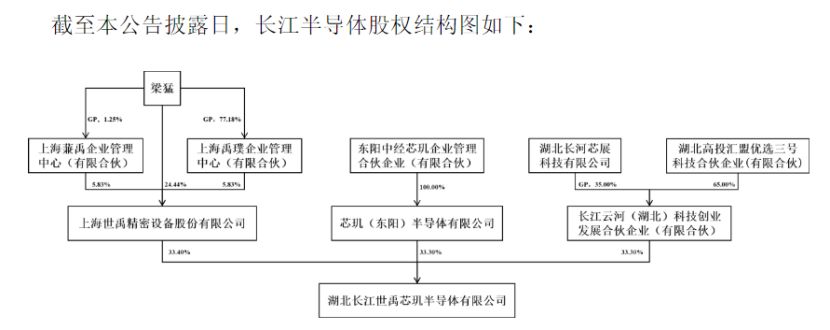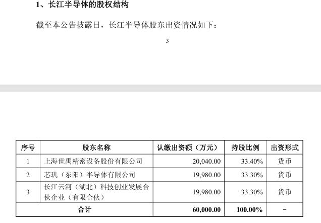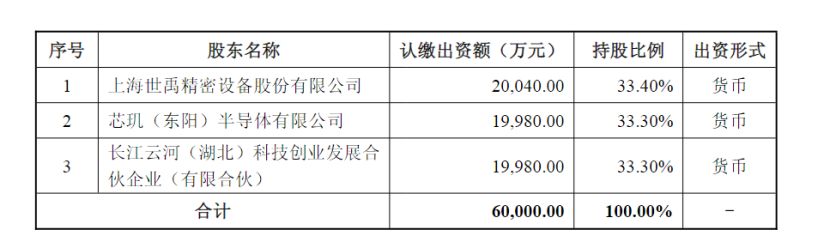 其股東包括:上海世禹精密設(shè)備股份有限公司(以下簡(jiǎn)稱上海世禹)持股33.4%,芯璣(東陽)半導(dǎo)體有限公司(以下簡(jiǎn)稱芯璣半導(dǎo)體)持股33.3%,長(zhǎng)江云河(湖北)科技創(chuàng)業(yè)發(fā)展合伙企業(yè)(有限合伙)(以下簡(jiǎn)稱長(zhǎng)江云河)持股33.3%。