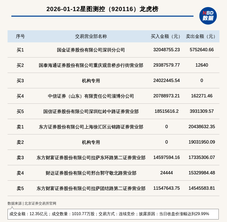 每經訊,2026年1月12日,北交所上市公司星圖測控(920116,收盤價:130.16元)登上龍虎榜,交易方式是連續(xù)競價,披露原因是當日收盤價漲幅達到29.99%,成交數量1010.77萬股,成交金額12.35億元。買一席位為國金證券股份有限公司深圳分公司,買入3204.88萬元;賣一席位為東方證券股份有限公司上海徐匯區(qū)云錦路證券營業(yè)部,賣出2043.86萬元。